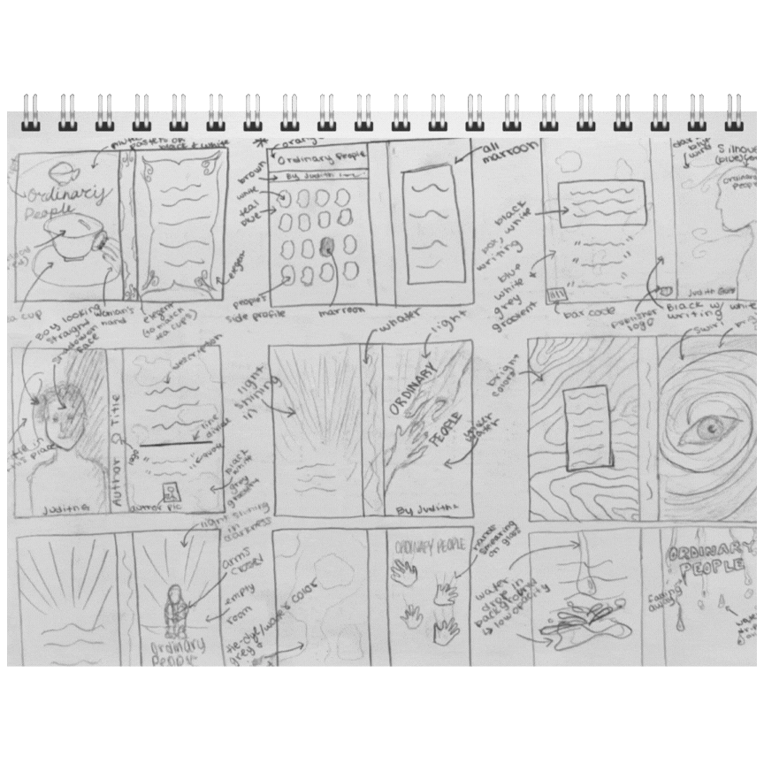I developed a series of exploratory sketches that translated the themes of Ordinary People into visual form. Drawing from both my research and key elements of the story, I experimented with different imagery, compositions, and symbolic details. These sketches allowed me to explore multiple interpretations of the book’s emotional depth before narrowing down the strongest concepts for refinement.